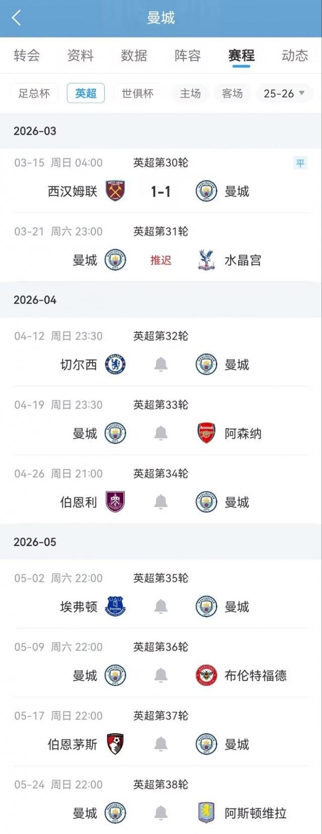 曼城赛季剩余联赛赛程↓