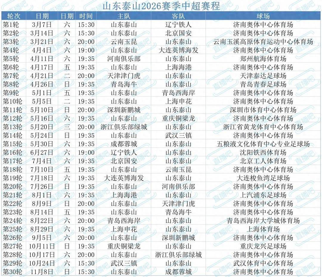 2月14日晚,2026赛季中超联赛赛程厚爱公布,联赛将于3月6日开幕,揭幕战放在了成都凤凰山体育公园,由成都蓉城对阵深圳新鹏城。山东泰山新赛季上半程占据安妥的主场上风,其中3月14日主场对国安、4月17日主场对海港、5月5日主场对申花,若是这三场比赛打好,将奠定统共这个词赛季的基调。